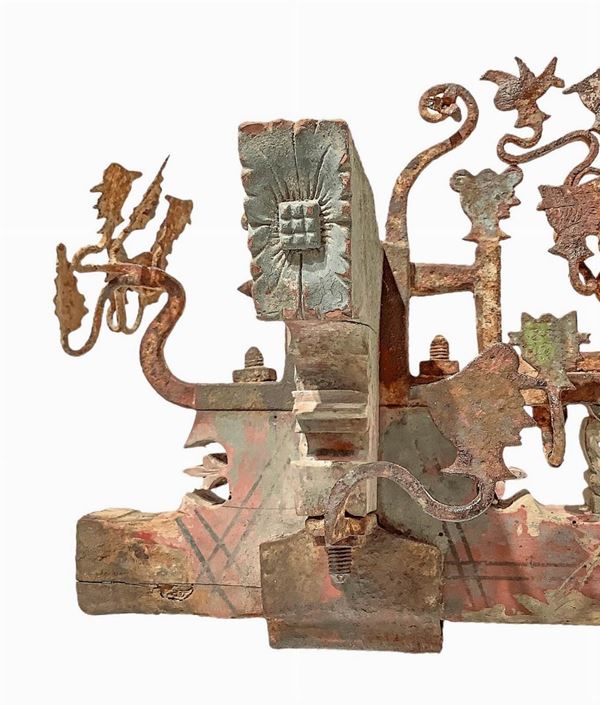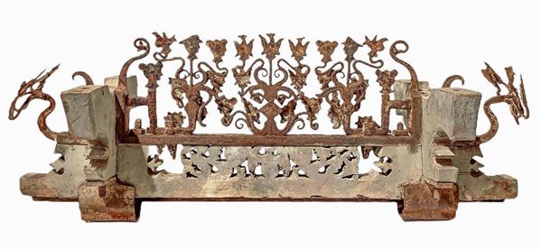 In polychrome wood carved to putti, masks and wrought iron for the baroque style with heads of paladins with Eaquile helmet,
