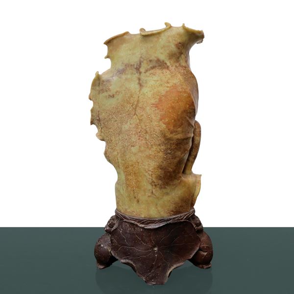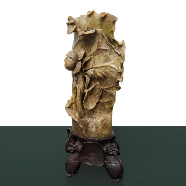 Vase in the shape of a rolled leaf with a lobed upper rim and with floral decoration in relief. Base with four feet, three of which are in the shape of a fish.