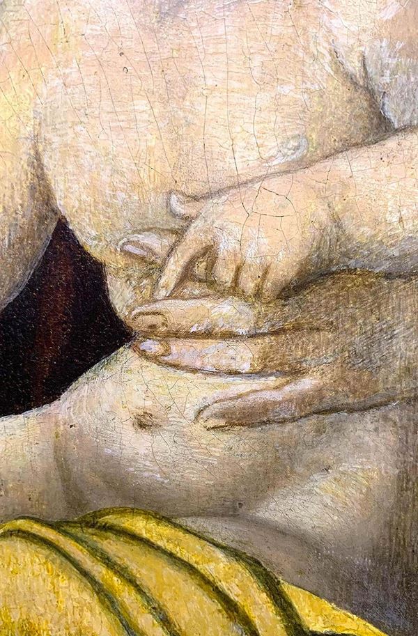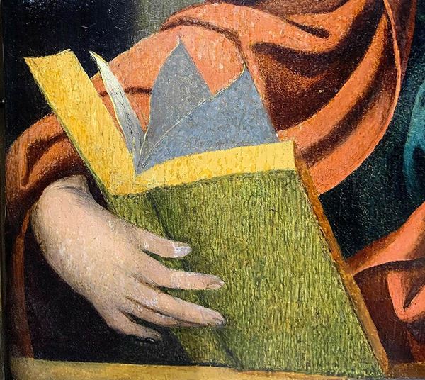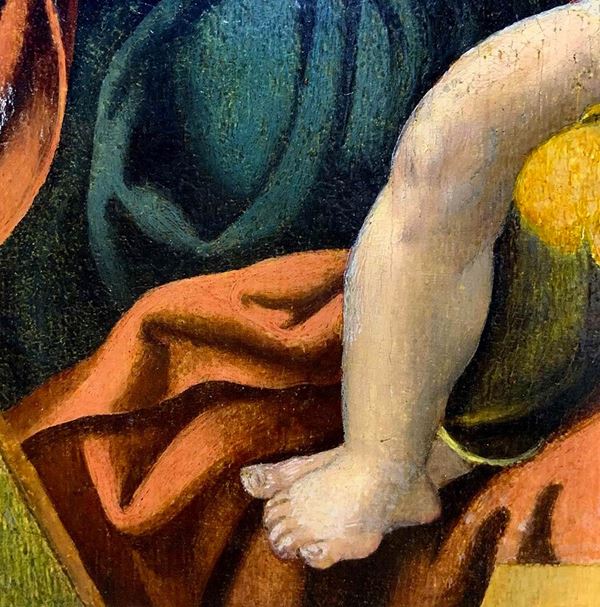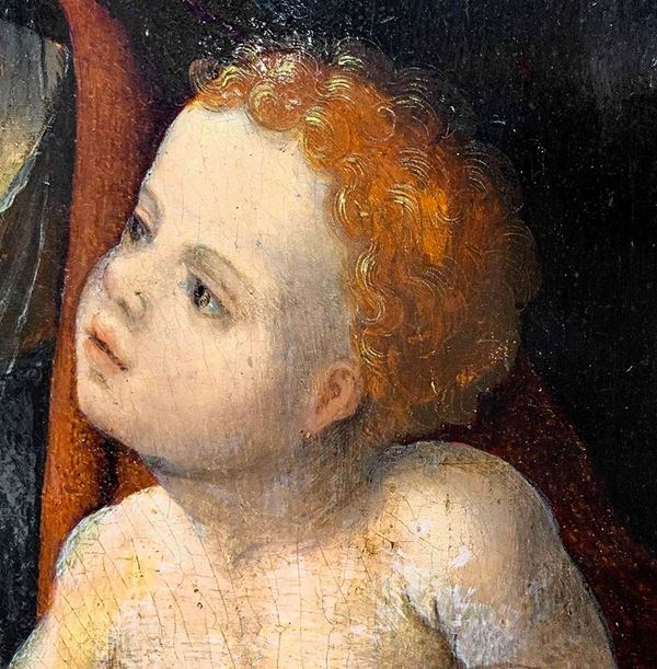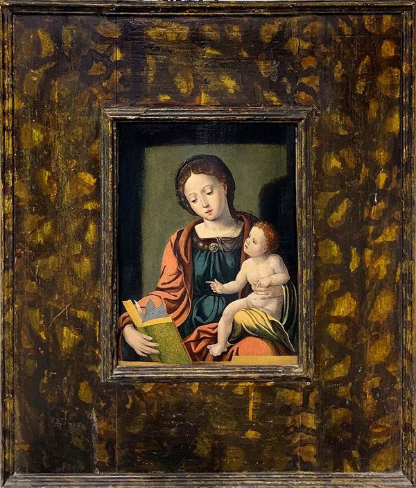 "An excellent Flemish Renaissance painter, he lived in Italy where he had the opportunity to appreciate the art of his contemporary Italian painters. He was a great admirer of Raphael, who often inspired him, as in this painting, even though he remained substantially atheist within his own stylistic canons and developments. He made an important contribution to the great Renaissance art in Flanders. A designer, painter and editor of architectural treatises, he was sought after by the most famous figures of his time: Charles V, Francis I King of France, Henry VIII of England, Cosimo I de' Medici. The influence of Italian Renaissance styles is evident in this work. He started the passage and transition from the late Gothic to the Renaissance conception in the Netherlands. The writings and treatises of Sebastiano Serlio were an example to him. This simple painting, probably for a private commission, is inspired in some way by Raphael's Madonna del Connestabile. In fact, the representation of the Madonna and Child is rendered in a real and fluid manner, giving naturalness to the scene. He abolishes the landscape background and focuses the figuration on the two characters, thus giving more strength to the spiritual meaning. A sad and melancholic harmony shines through and is palpable, at the same time a serenity transmitted by the characters, especially in the gaze of Mary, who reads the prophecy on the death of Jesus, with sweet resignation while the child orders her to read by pointing with his finger. The shapes are well calibrated and the gestures of the child pointing and of the Madonna who holds him protectively around the waist, make the scene happy and full of harmony. A light that seems to come from a window focuses the characters and illuminates the painted clothes in a soft and fluid way. It was an example for all those Dutch-Mannerist painters of the second half of the 16th century. 40x30, oil on panel. Provenance: illustrates a family from Catania." ASORstudio