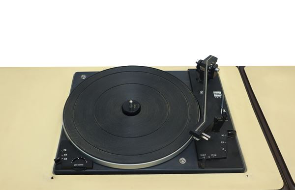 The structure is made of lacquered plywood casings and a perspex cover that protects the turntable. Anodized aluminum metal trolley, with four ball rubber wheels, painted black on the edges. To be overhauled.