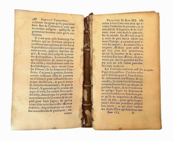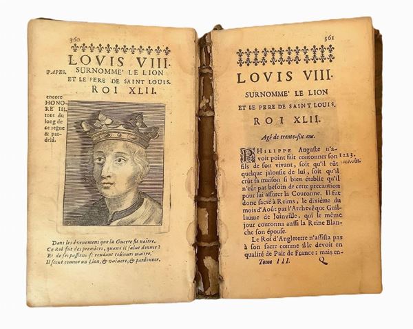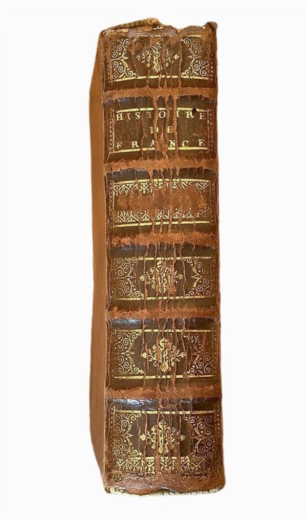 Francois Eudes de Mèzeray (Ri, 1610 – Parigi, 1683) è stato un celebre storico francese. Le sue principali opere furono “Histoire de France depuis Faramond jusc’au règne di Louis le juste” (1641-1651) e “Abrége chronologique” (1667-1668). Nel 1649 venne ammesso all’Académie Francais e nel 1675 ne divenne Segretario permanente. La presente opera di storia che va dal 1081 al 1328, divisa in tre Parti, arricchita di n. 10 ritratti per ciascuno dei Re descritti, con rilegatura in pelle e fregi in oro è stata pubblicata dopo 4 anni dalla morte di Eudes de Mèzeray ma sino ad oggi non è ricordata in alcuna delle sue biografie e pertanto è piuttosto rara e da studio.