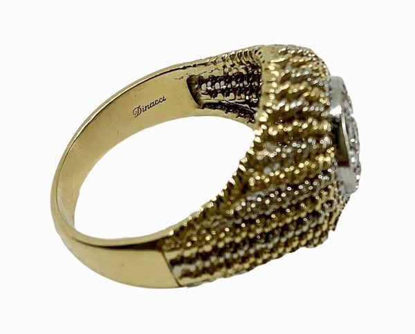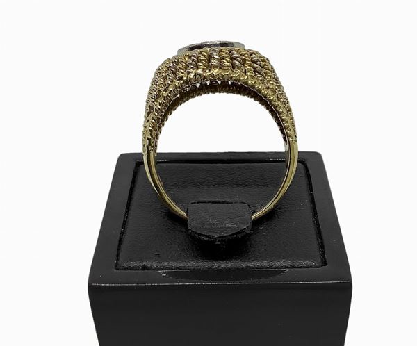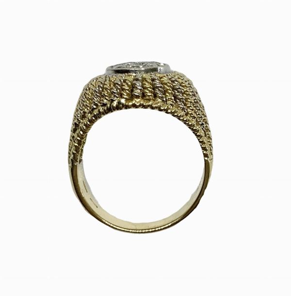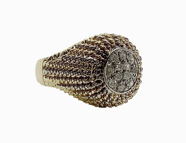 Lavorazione in oro bianco e giallo, maglia lavorazione a cestino in oro bianco e rosso. Nella parte centrale scagliette di brillanti.