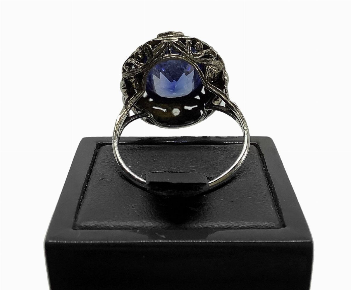 Lavorazione in oro bianco con pietra blu e scagliette.