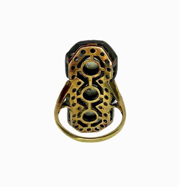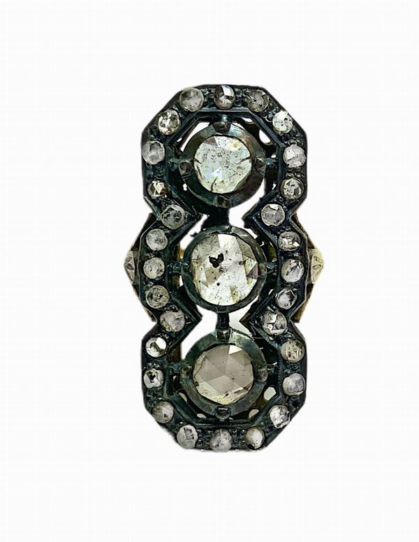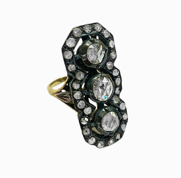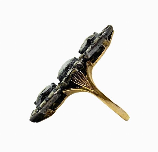 Anello in oro e argento 3 grosse rose coronè centrali e rosette di diamanti intorno