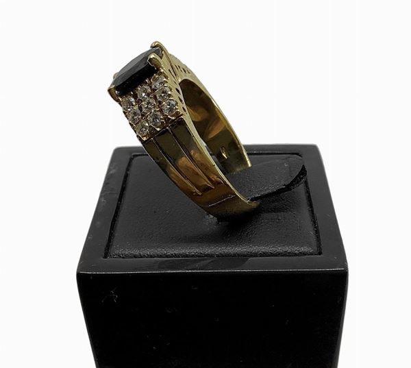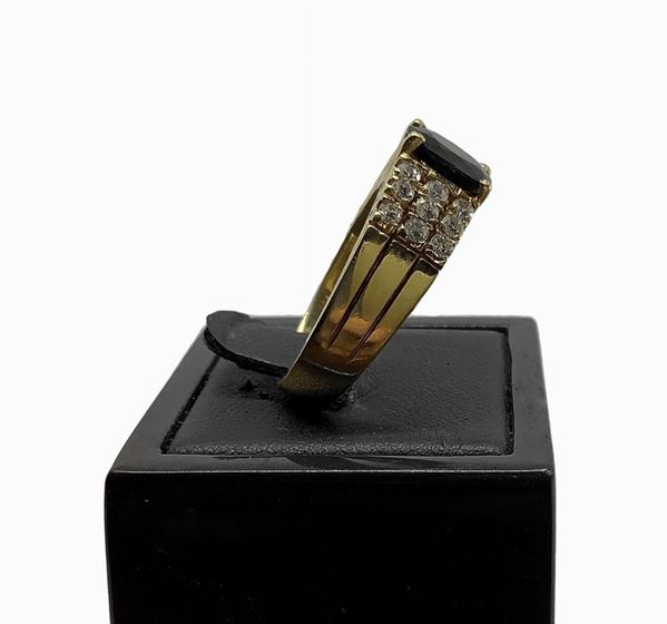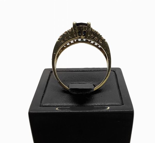 In oro giallo con zaffiro centrale, ovale e sfaccetato. Piccoli brillanti nelle parti laterali.