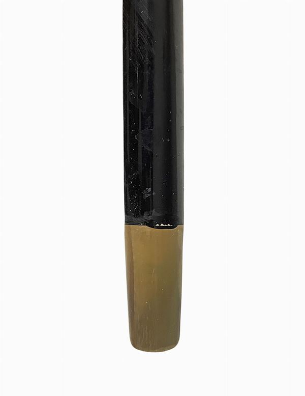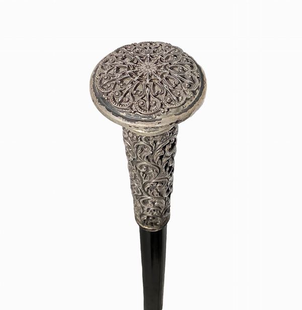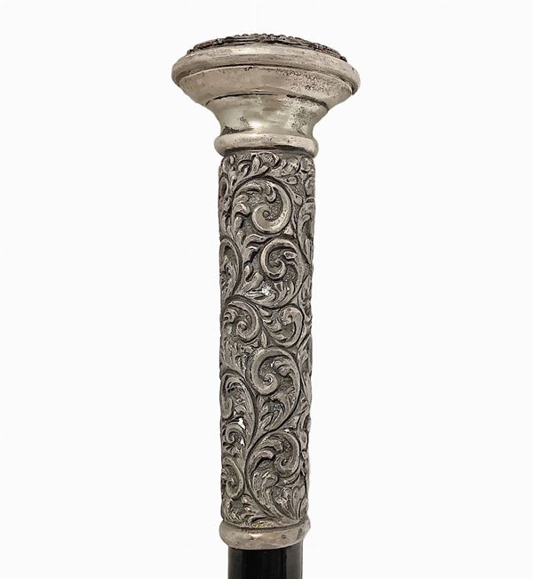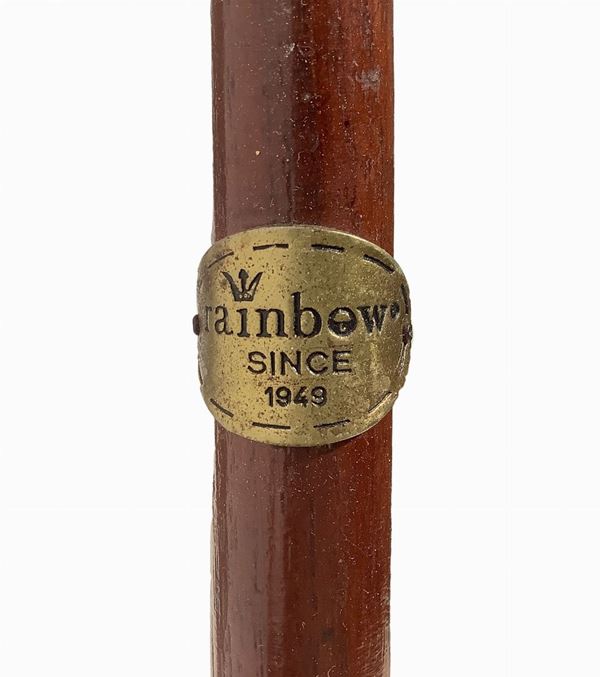 In legno. Uno con impugnatura in argento con canna di malacca ebanizzata nera, puntale in osso. L'altro marca Rainbow.