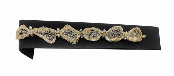 Maglia in filigrana morbida con piccoli cerchi in oro portanti acquamarine sfaccettate, susta in oro.