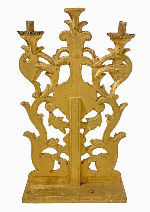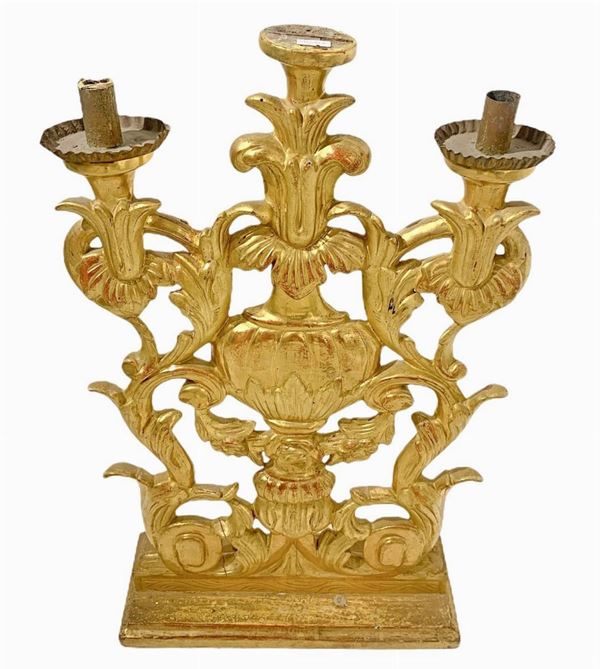 Candeliere a tre luci in legno dorato, XVIII secolo., XVIII secolo