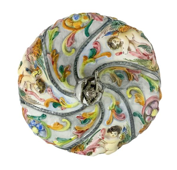 Carillon porta sigarette a pagoda,in maiolica decorata con puttini e metallo argentato, Anni 40/50