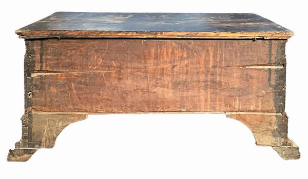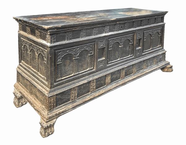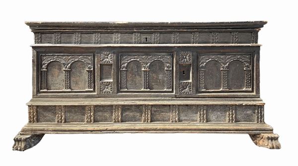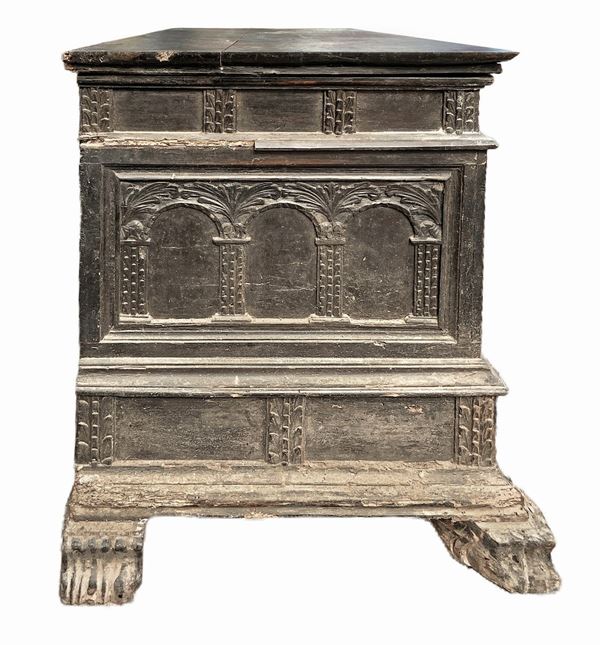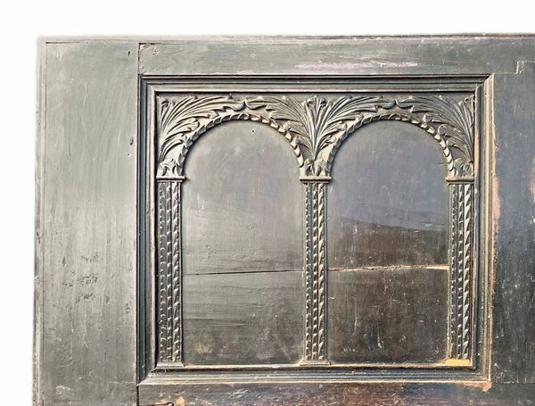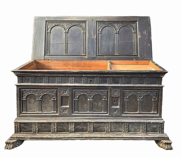 Cassapanca in legno di noce intagliata sul fronte con colonne e archi., XVIII secolo