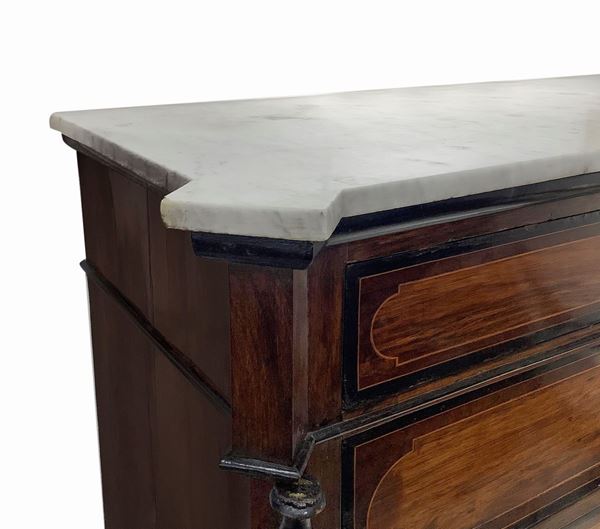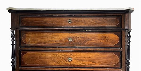 Impellicciato in palissandro, fronte perfilato. Piedi a mensola, marmo bianco carrara al piano. Colonne in legno ebanizzato nero sui lati