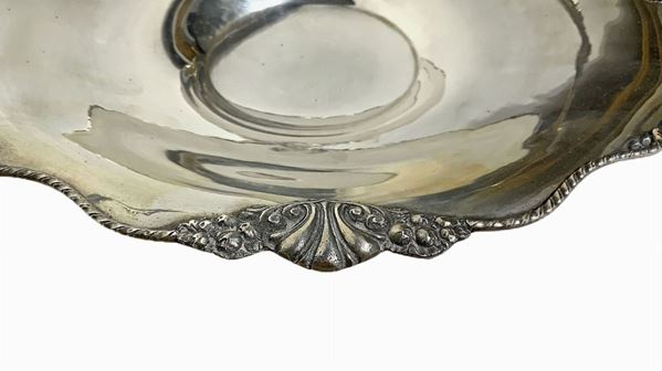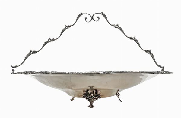 H cm 7, con manico cm 17, larghezza cm.29. Decorazioni al bordo ed al manico gr. 648