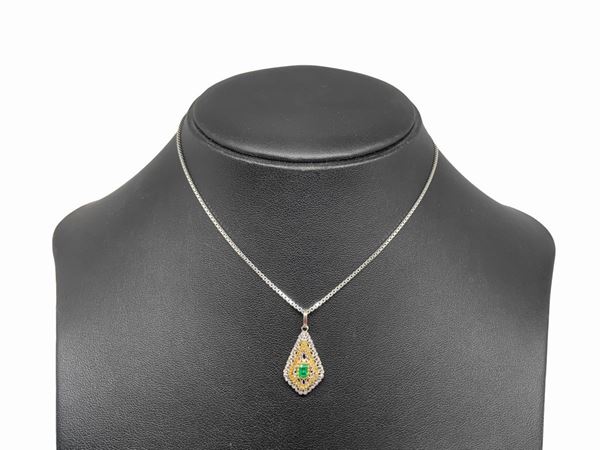 Lavorazione in oro bianco con pendentif in oro giallo e bianco con piccolo cabochon di smeraldo.