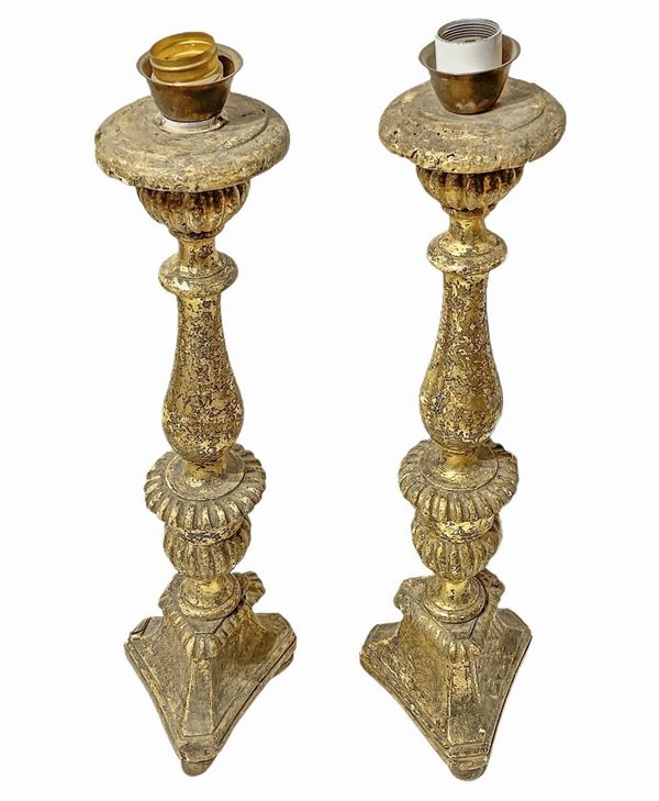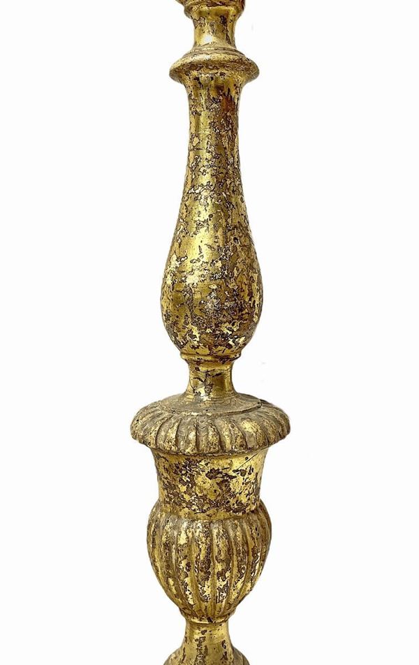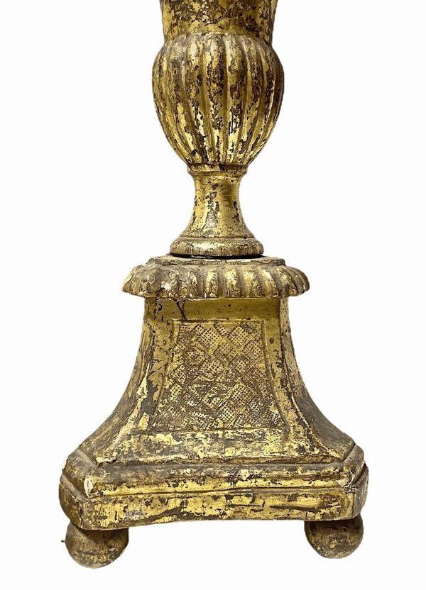 Coppia candelieri in legno dorato in tutti e tre i lati., Fine XVIII secolo.