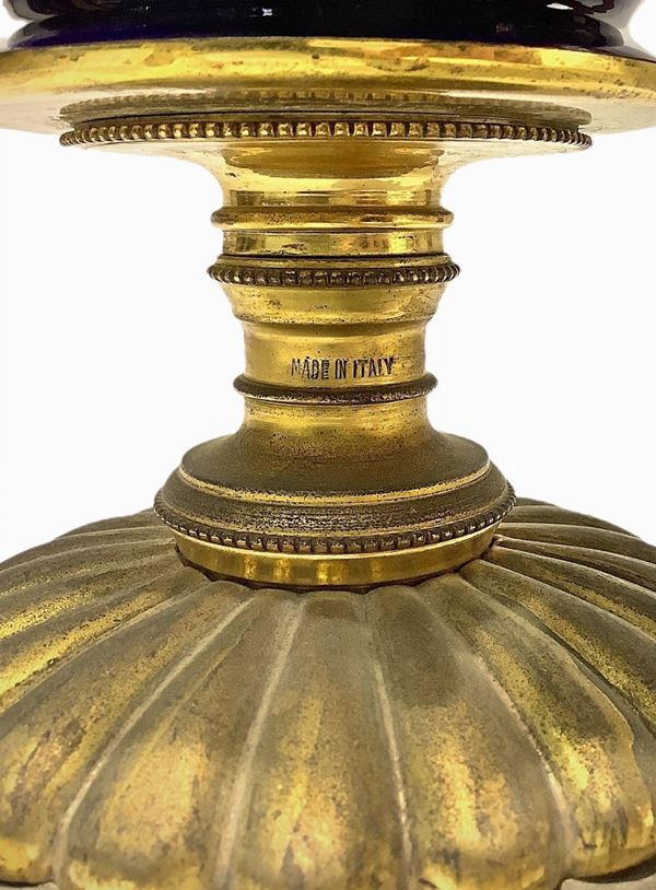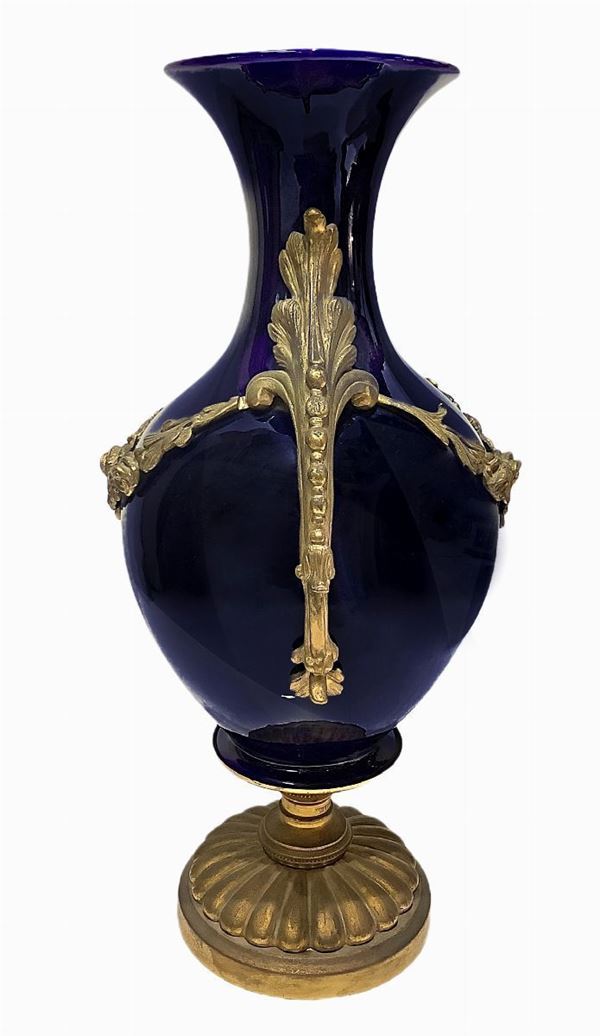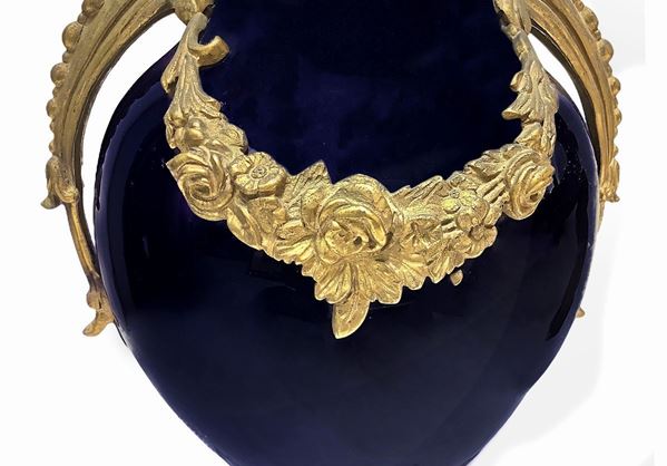 Coppia di vasi in porcellana blu, con applicazioni in bronzo dorato., XX secolo