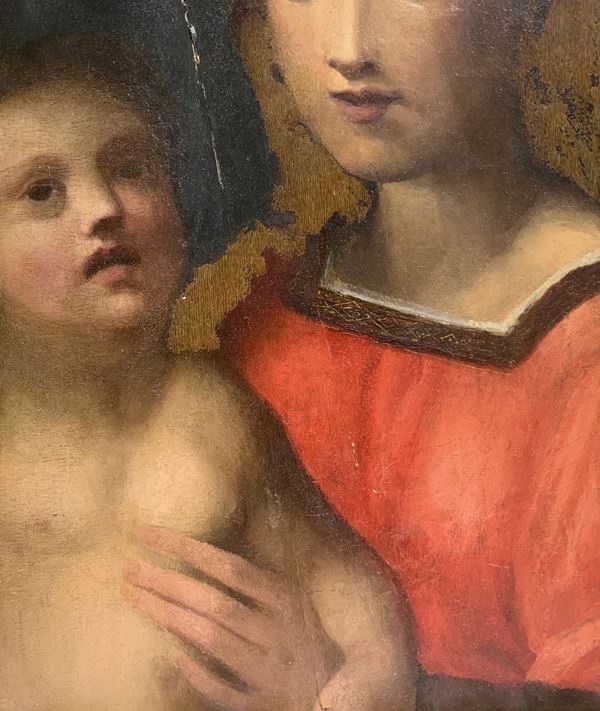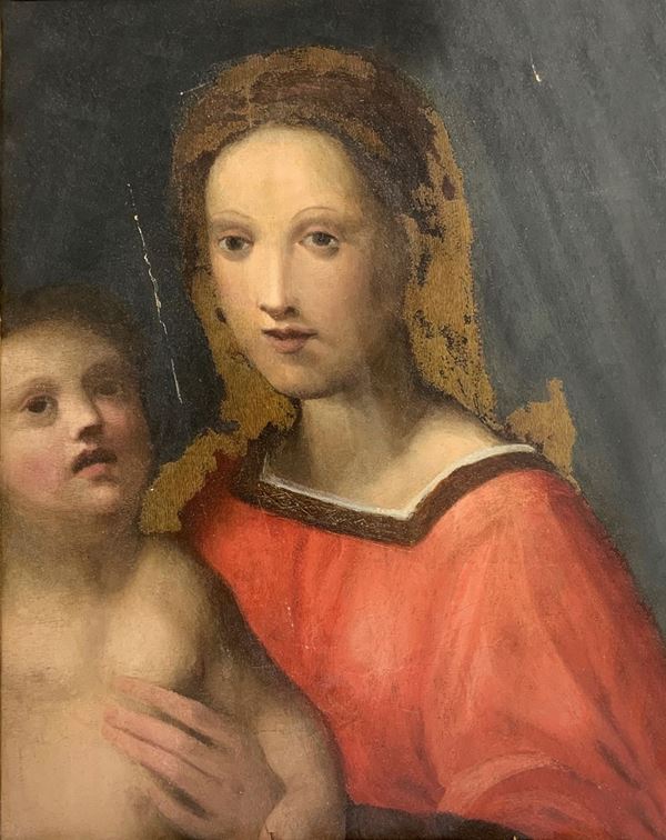 Dipinto ad olio su tavola raffigurante Madonna con bambino., XVII secolo.