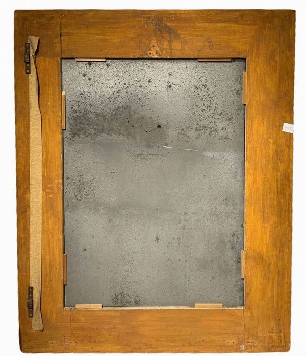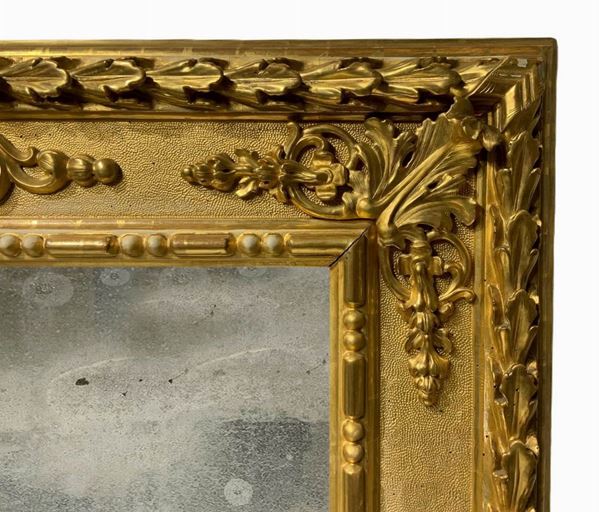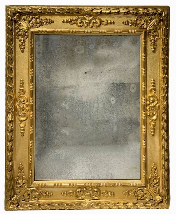 In legno scolpito a diversi ordini con foglie d'acanto, fregi barocchi, segmenti e pallottolato. Specchio al mercurio