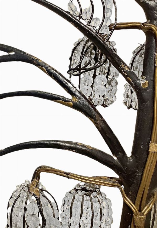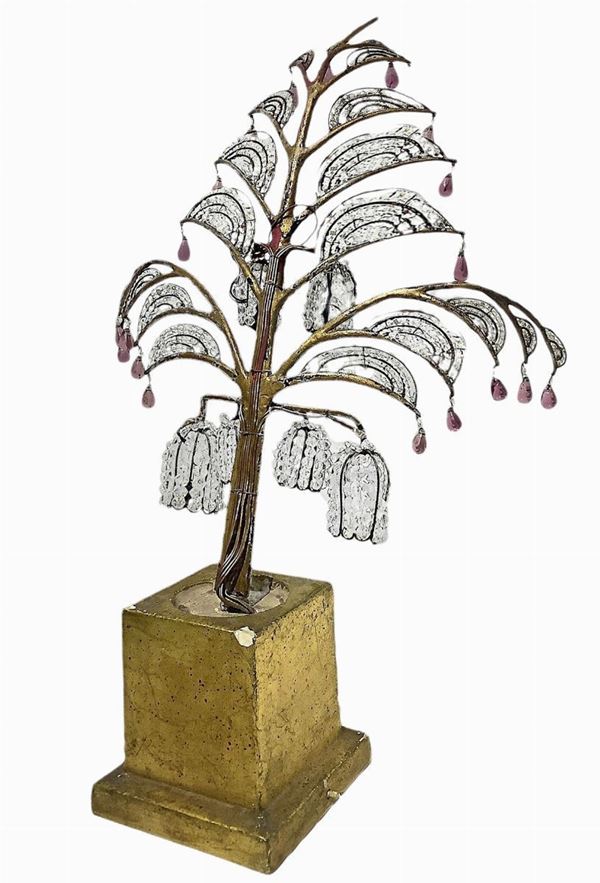 con base in legno dorato e struttura in metallo con decori a sfere di vetro con superficie sfaccettata e gocce in vetro nei toni dell'ametista