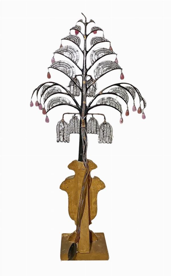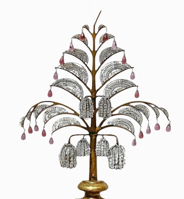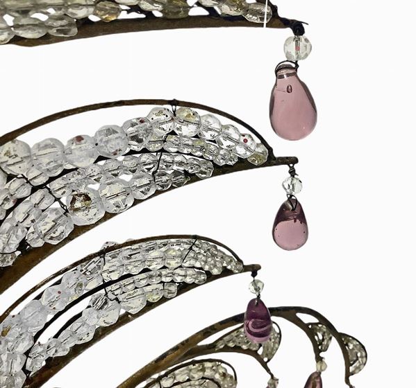 con base in legno dorato e struttura in metallo con decori a sfere di vetro con superficie sfaccettata e gocce in vetro nei toni dell'ametista