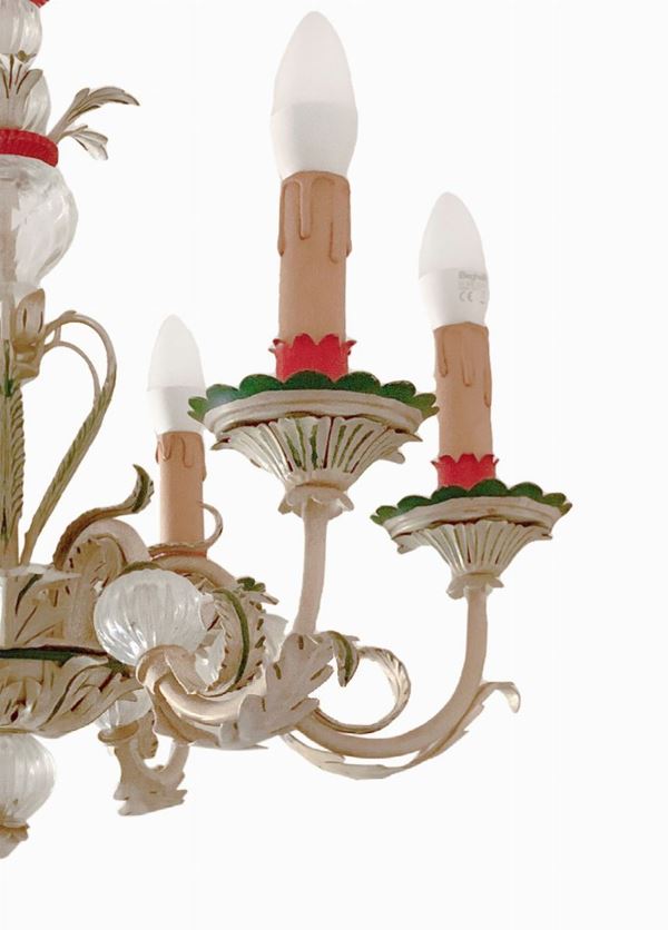 Lampadario in metallo laccato policromo e vetri sferici. A sei luci.