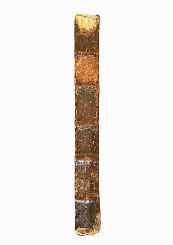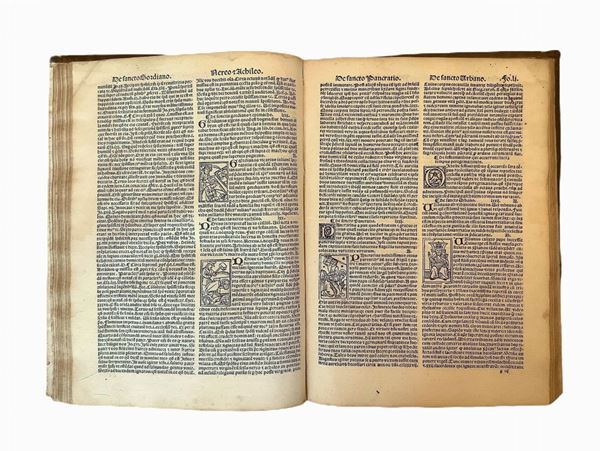 Jacopo da Varazze (o da Varagine o da Voragine o Beato Jacopo de Fazio) (1230 -1298) fu un frate domenicano, Arcivescovo di Genova. A partire dal 1260 sino al 1298 si dedicò alla compilazione di questa sua compendiosa Opera manoscritta in latino, la Legenda Aurea. Si tratta di un santorale agiografico, ossia una raccolta di oltre cento cinquanta vite di Santi (dall’antichità sino ai suoi giorni) intercalate da una trentina di capitoli dedicati alle principali feste cristologiche, mariane e liturgiche. Quest’Opera (una summa dell’agiografia sino al Sec. XIII) ebbe un grandissimo seguito durante tutto il medioevo (rimangono circa 1400 codici manoscritti e miniati. Con la nascita della stampa, continuò la sua enorme diffusione di riedizioni, sino ai nostri giorni. Il presente volume del 1535 venne curato dal domenicano Claudio de Rota ed è considerata l’edizione antica più importante sia per la rigorosità del testo e, principalmente, per la pregevole cura artistica: l’inizio della descrizione della vita di ciascuno degli oltre 150 Santi e delle singole feste riportate è indicata con un capilettera nel quale è raffigurato il Santo del quale si parlerà. La rilegatura è in pelle coeva, con titolo in oro sul dorso ed i fogli di carta sono filigranati con la scritta “B LAUS DEO”. L’unica altra copia esistente è conservata nella Biblioteca Guarnacci di Volterra