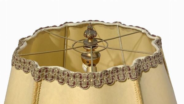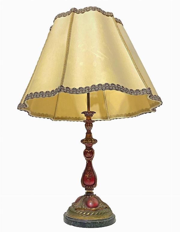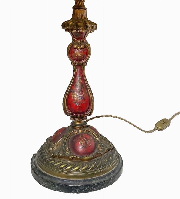 Lume in ottone policromo con decorazioni floreali nei toni del rosso, XX secolo
