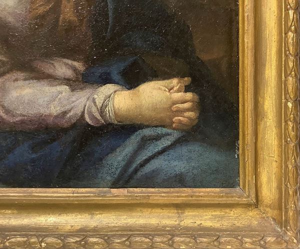 In essa notiamo una realizzazione particolare e una scansione pittorica fondata su applicazioni di toni blu e grigoazzurri, trascoloranti e pervasi da una luce fredda a cui fa da contrasto incarnato roseo del viso e delle mani.