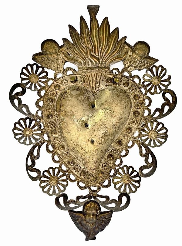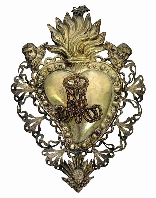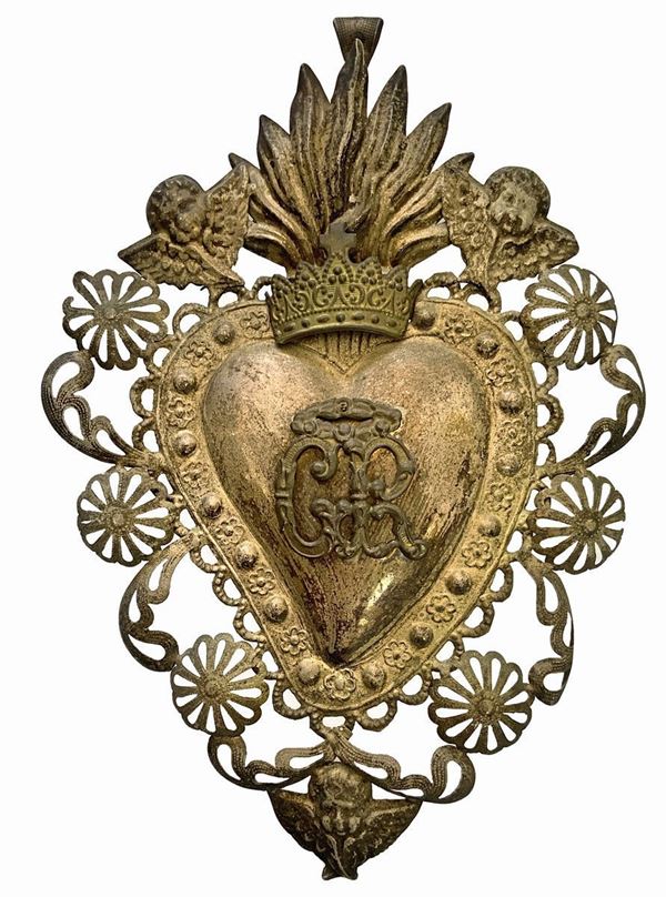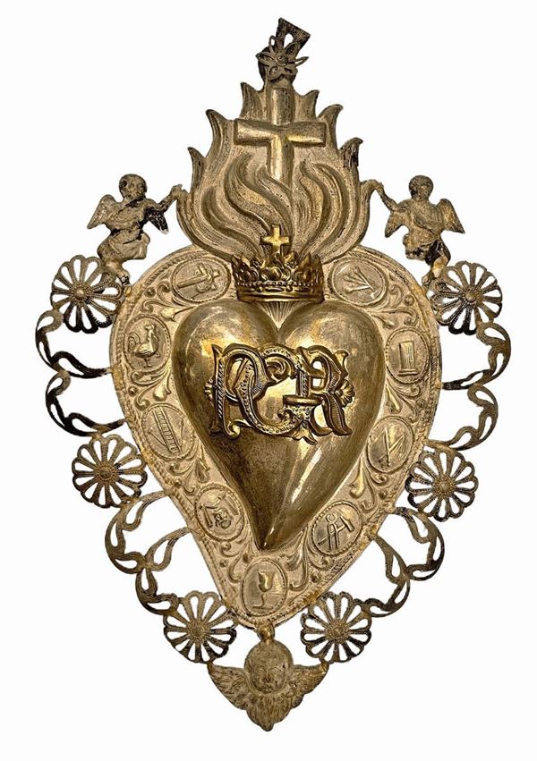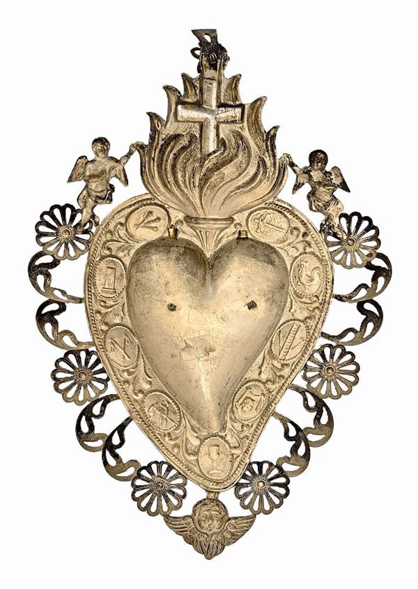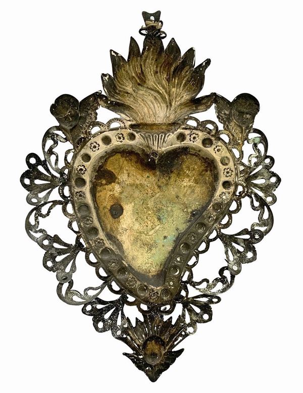 N 3 Ex voto in argento a forma di cuore con puttini e zefiri. 1) H cm 21 2) H cm 22 3) H cm 23