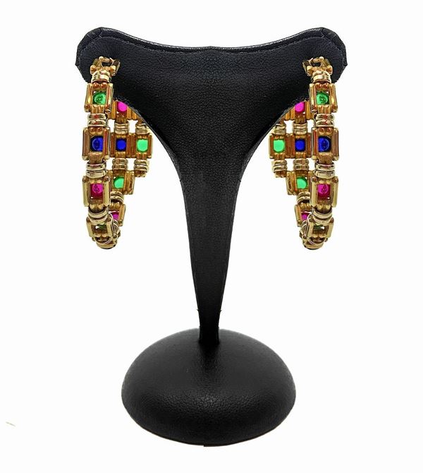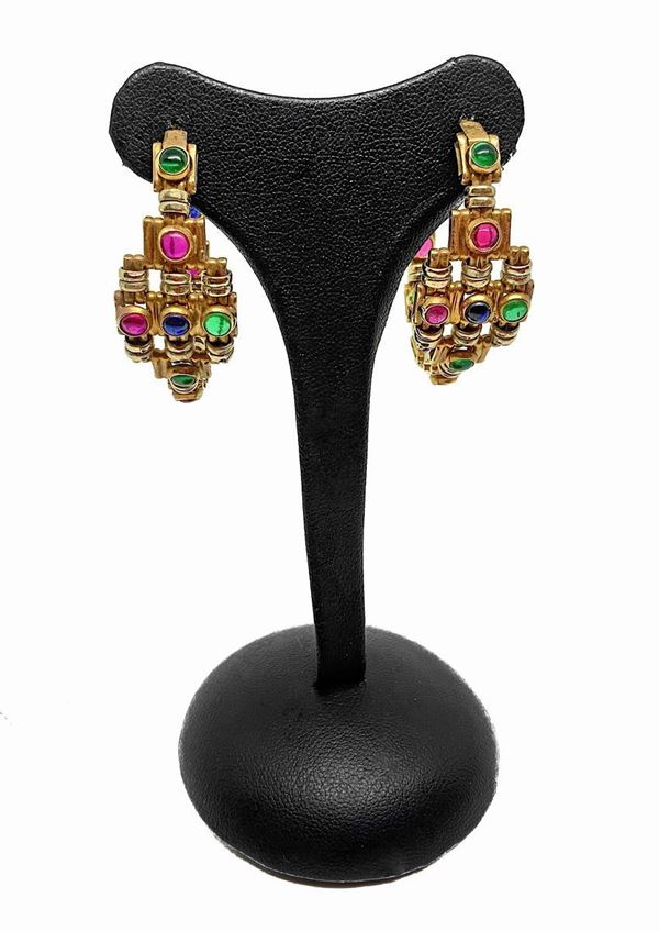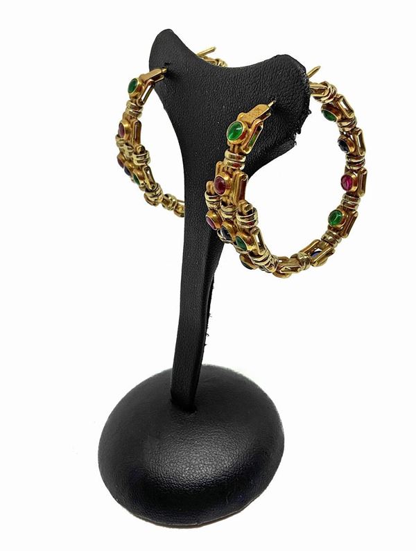 Ricca lavorazione in oro rosso e giallo con radici di rubino, smeraldo e lapislazzuli