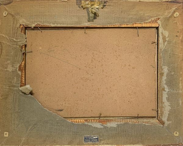 Firmato con monogramma S.P. in basso a sinistra, etichetta con nome dell'artista sul retro ed in basso al centro. In cornice nera ebanizzata guilloché