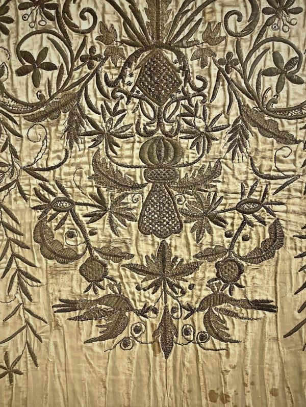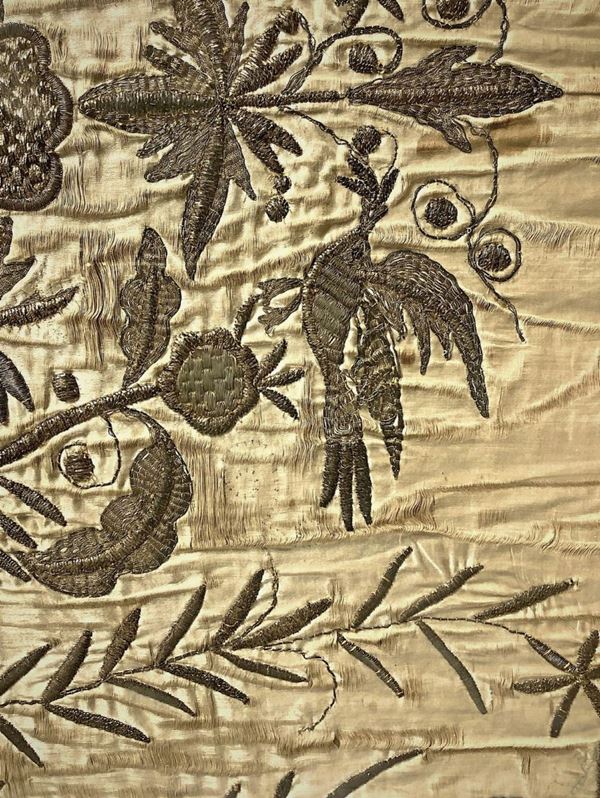 Paliotto ricamato in oro raffigurante ramage con vaso e foglie., XVIII secolo.