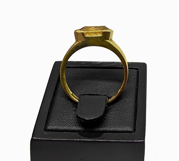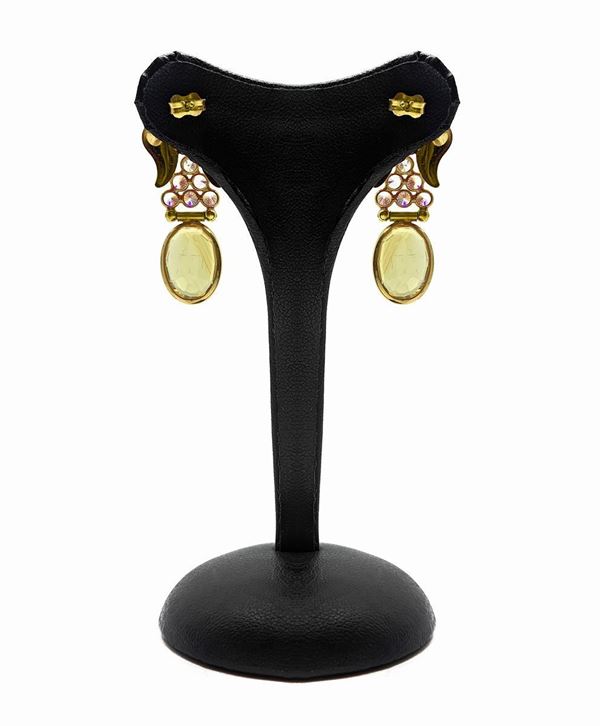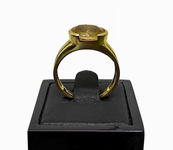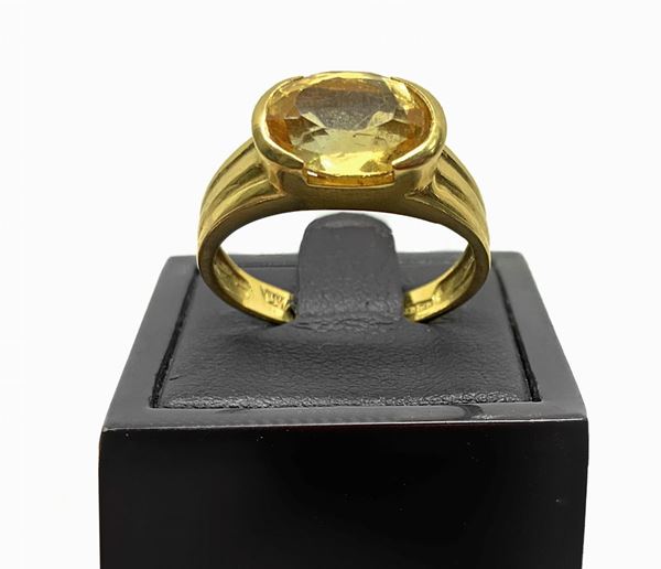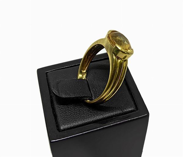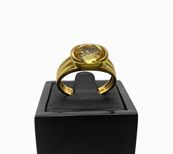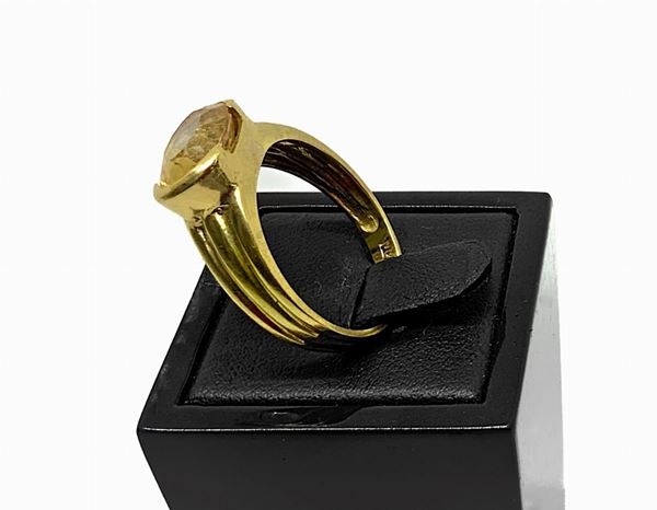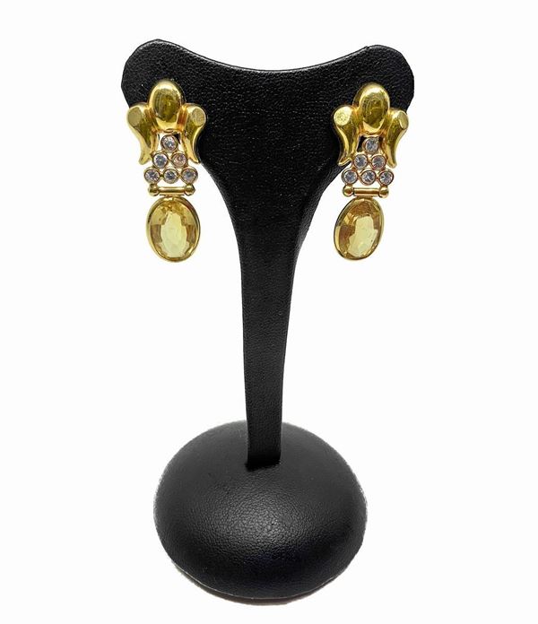 Composto da anello in oro giallo con topazio sfaccettato. Orecchini pendenti con topazio ovale sfaccettato e brillantini.