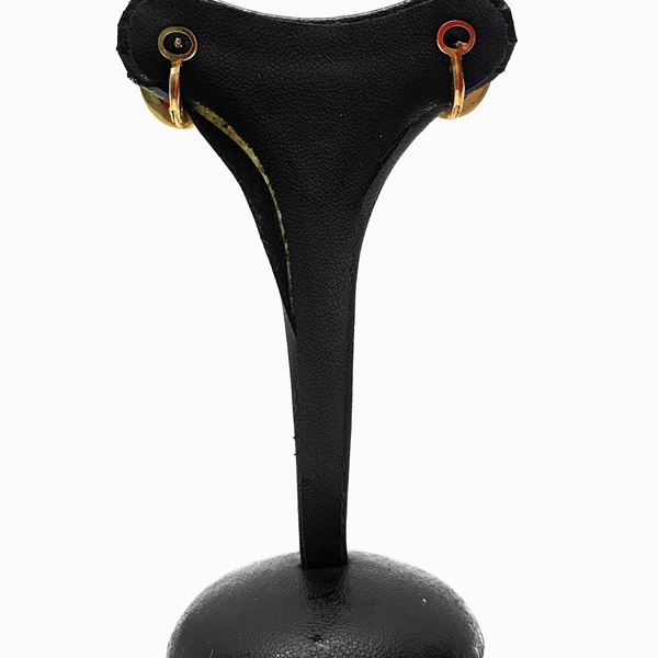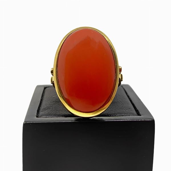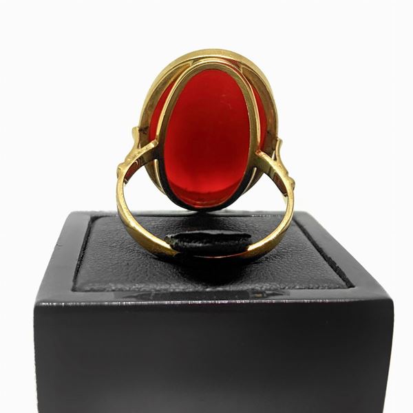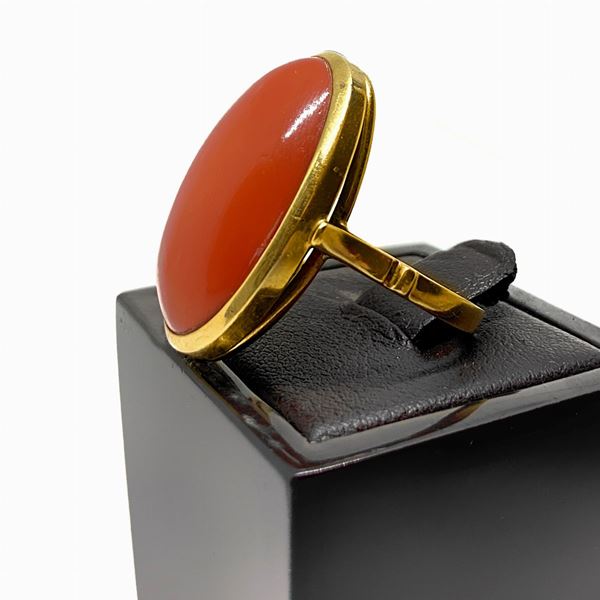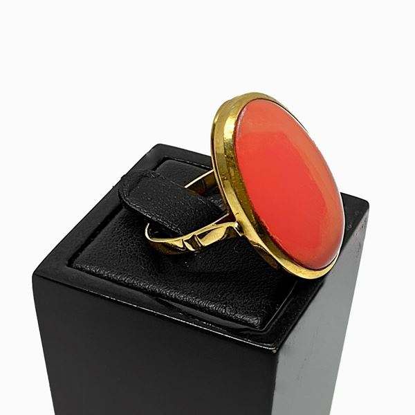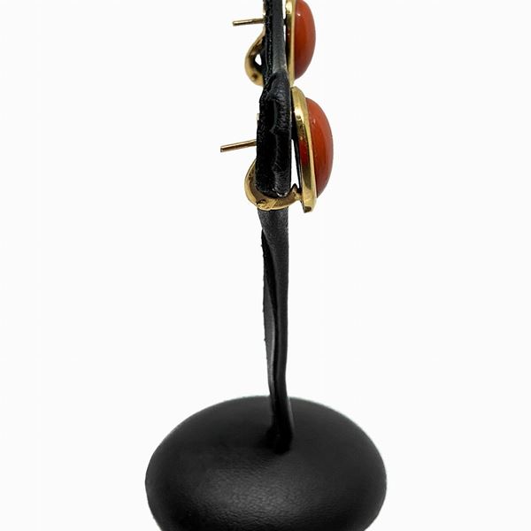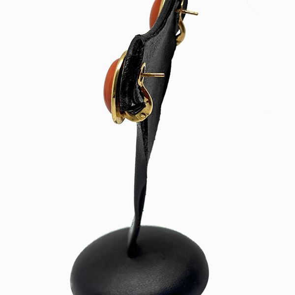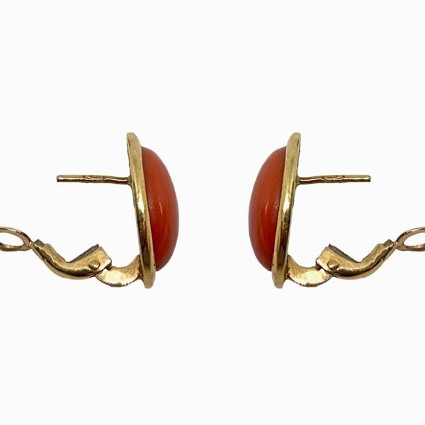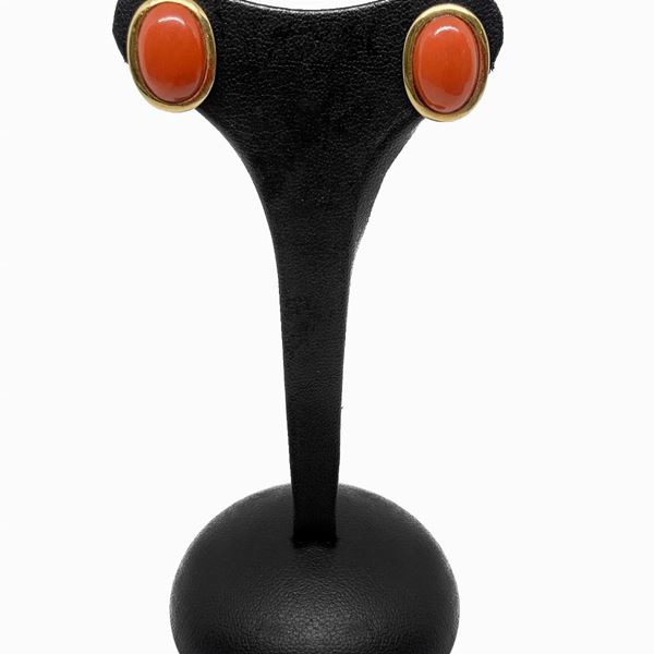 Anello in oro rosso con pietra ovale centrale in corallo. Orecchini al lobo in oro rosso e centrale in corallo.