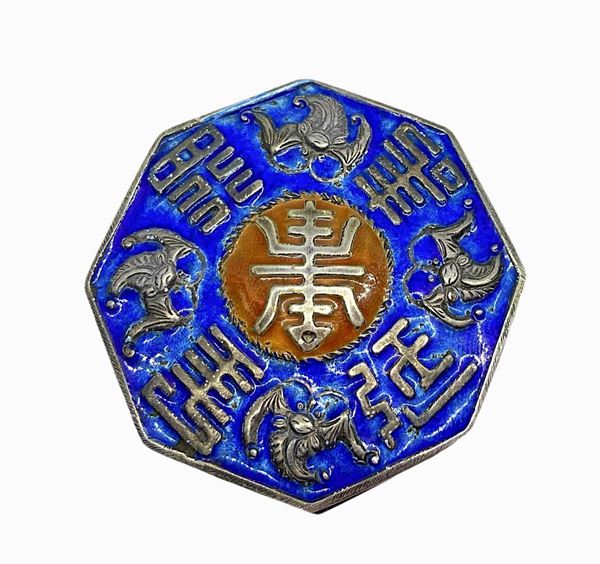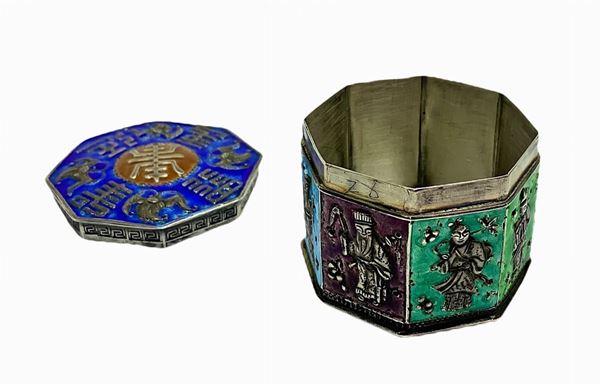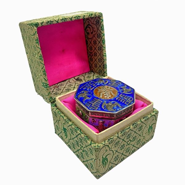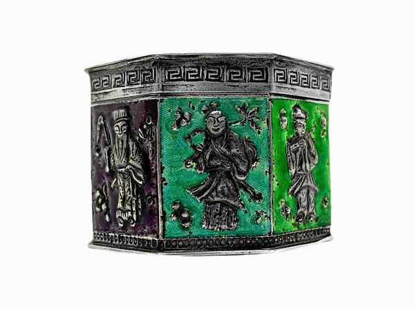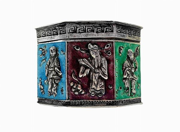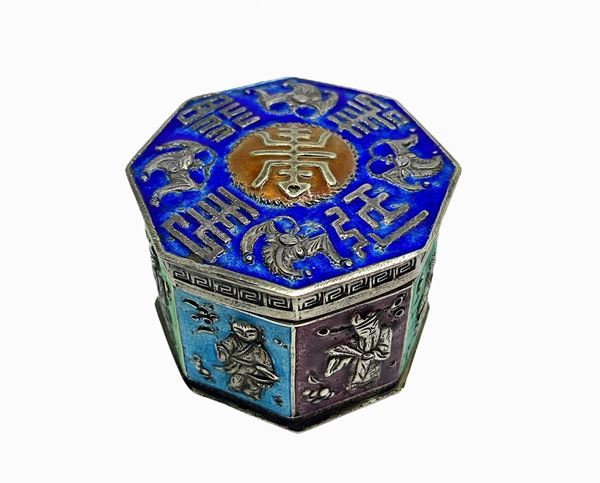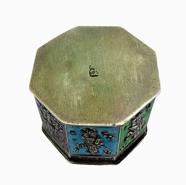 Piccola scatola di forma ottagonale con figure e simboli giapponesi a rilievo policromo