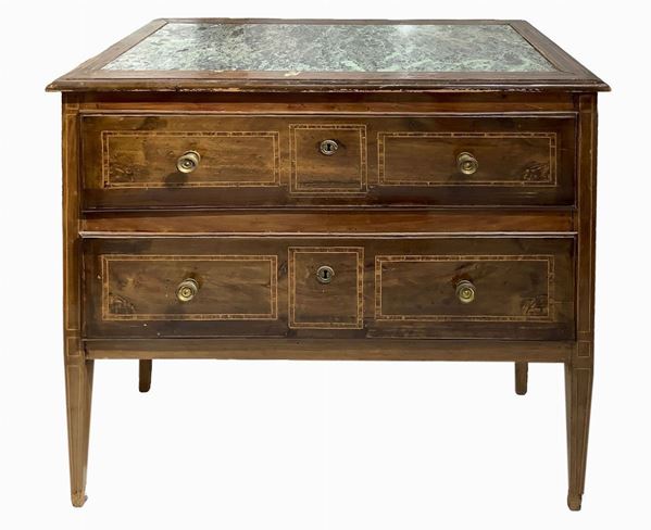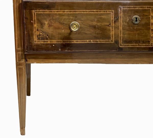 A due cassetti, in legno di noce con inserti perfilato in legni chiari e inserti in palissandro. Marmo grigio incassato al piano, piedi troncopiramidali.
