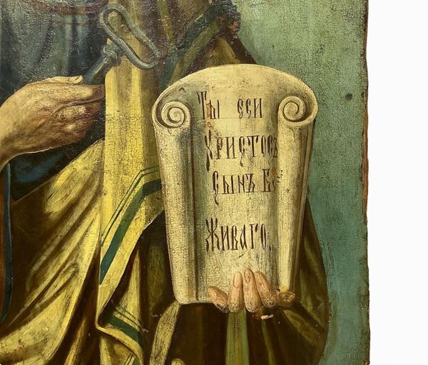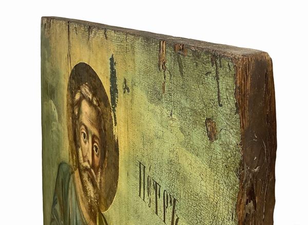 Il santo - identificato in San Pietro per la presenza del suo attributo, la chiave, tenuta nella mano destra e per l’iscrizione in alto che recita: CB. APOS. PÉTRZ, la cui traduzione significa SAN APOSTOLO PIETRO - è raffigurato stante, con gli occhi sbarrati e fissi, mettendo in tal senso in risalto la sua natura spirituale. Nella mano sinistra, invece, egli regge un cartiglio di colore bianco contenente una formula, che tradotta rivela: TU SEI IL FIGLIO DEL DIO VIVENTE.