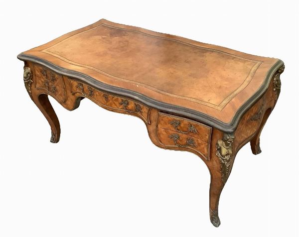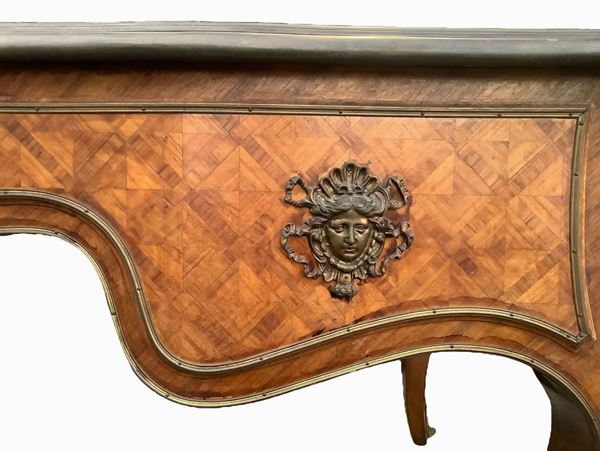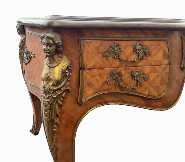 In legno bois de rose, con bronzi in ottone dorato, piano in pelle.