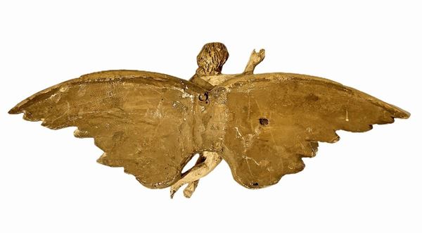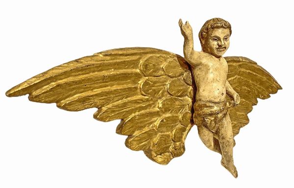 Scultura con angelo policromo in legno laccato e dorato a foglia.