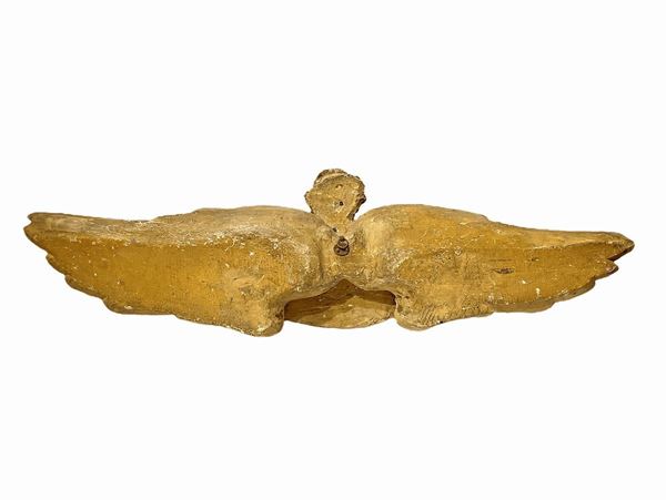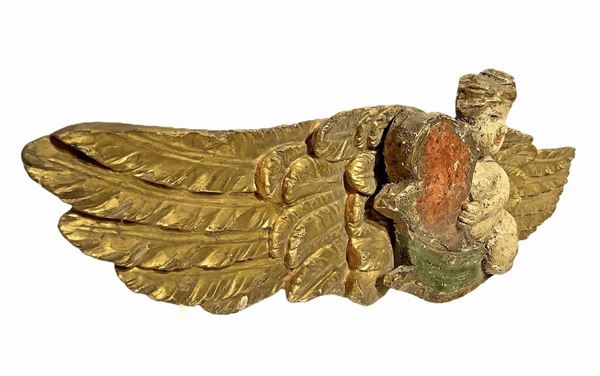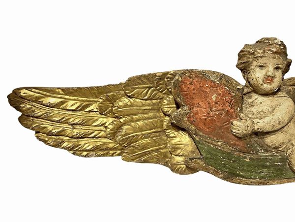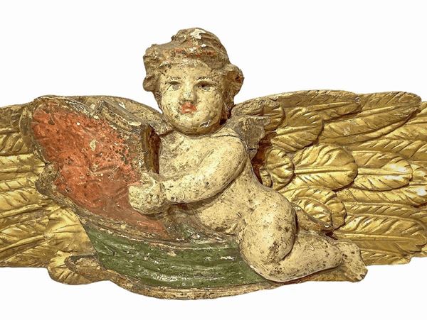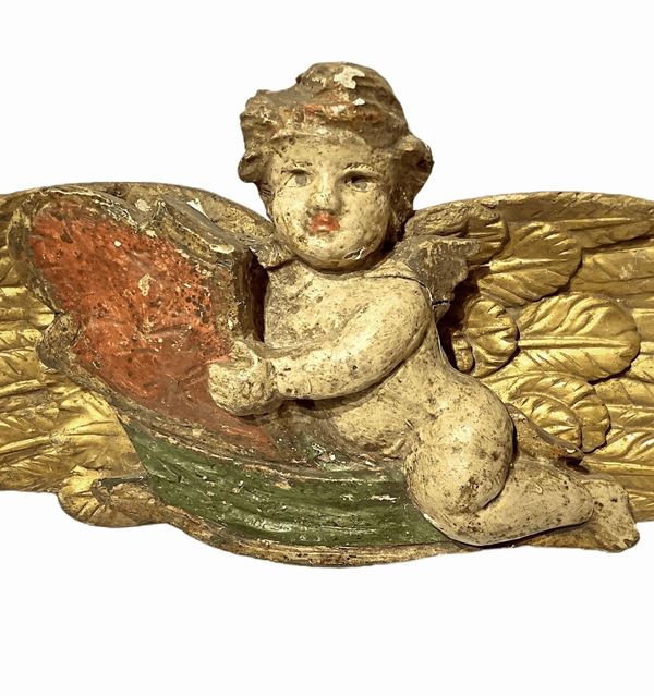 Scultura con angelo policromo in legno laccato e dorato a foglie.