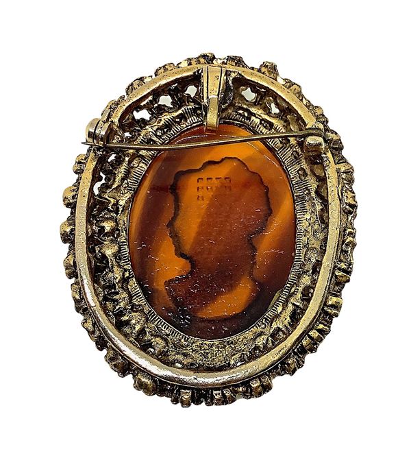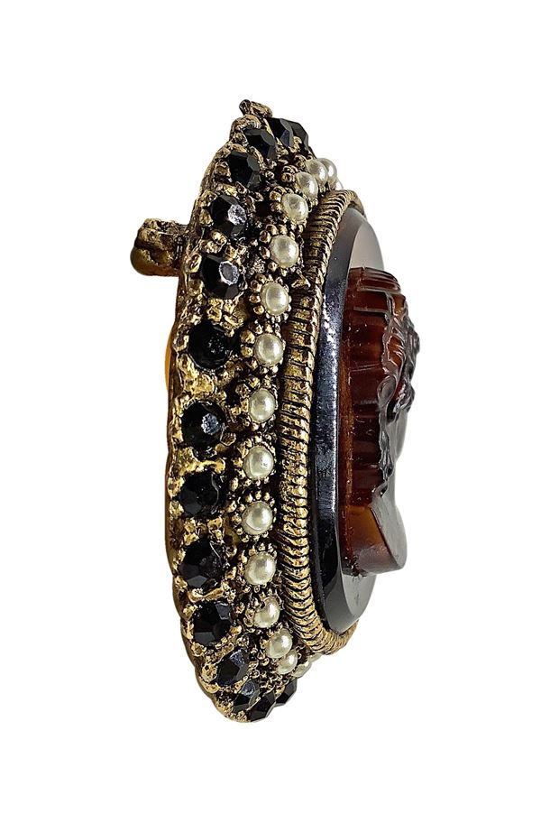 Lavorazione in pasta di vetro raffigurante volto di donna, contornata da piccole perline e pietre nere