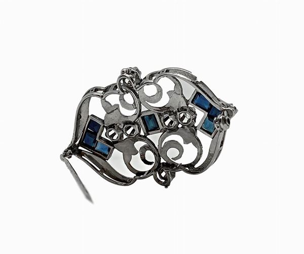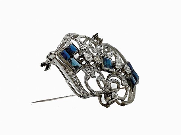 Lavorazione in oro bianco con sei zaffiri sfaccettati laterali più uno centrale e sei brillanti di 0,25 circa.