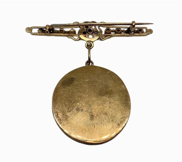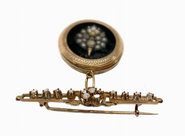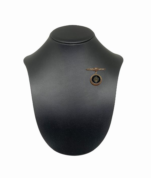 Spilla in oro antico con rose e ciondolo pendente su fondo in smalto nero