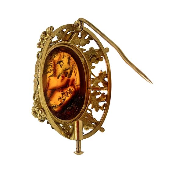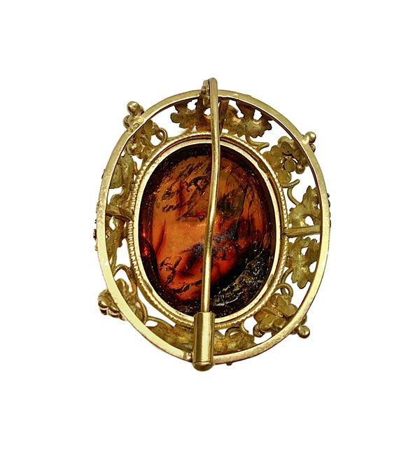 Ricca lavorazione con grappoli d’uva e foglie in oro rosso con pietra centrale in ambra