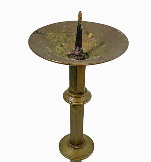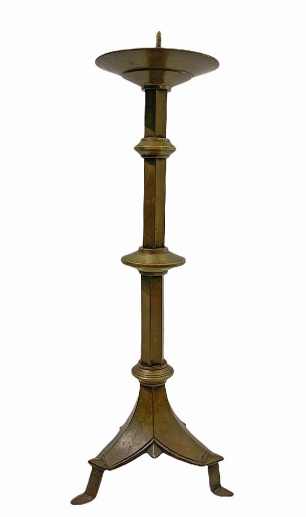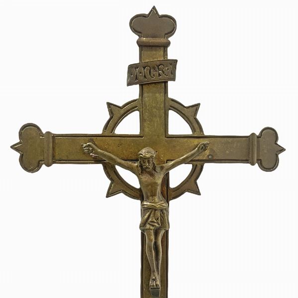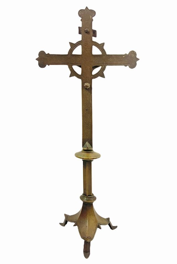Trittico in bronzo dorato composto da Cristo in croce e coppia di candelabri, XIX secolo