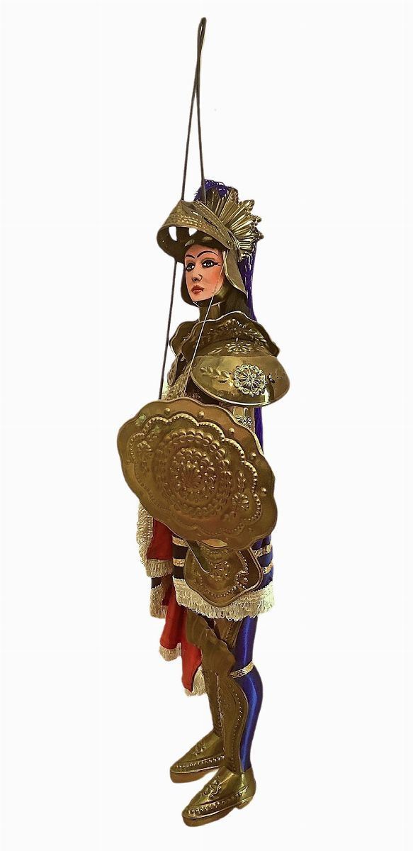 Opera artigianale di uno dei più grandi pupari siciliani, Salvatore Faro, “u Lumaru” (Catania, 1921-1970). Impresario che gestì il proprio Teatro di Via Carlo Forlanini a Catania nel quale, durante gli spettacoli, svolgeva anche il ruolo di Parraturi e di Maniante dei pupi. Disegnava e dipingeva i Cartelloni per gli spettacoli serali e costruiva i relativi “pupi” da “Combattimento” e da “Mini-combattimento”. E’ ricordato come celebre maestro di una stirpe di Pupari.