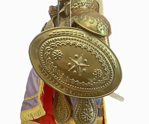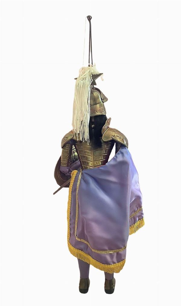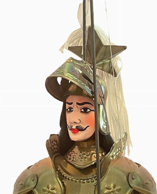 Opera artigianale di uno dei più grandi pupari siciliani, Salvatore Faro, “u Lumaru” (Catania, 1921-1970). Impresario che gestì il proprio Teatro di Via Carlo Forlanini a Catania nel quale, durante gli spettacoli, svolgeva anche il ruolo di Parraturi e di Maniante dei pupi. Disegnava e dipingeva i Cartelloni per gli spettacoli serali e costruiva i relativi “pupi” da “Combattimento” e da “Mini-combattimento”. E’ ricordato come celebre maestro di una stirpe di Pupari.