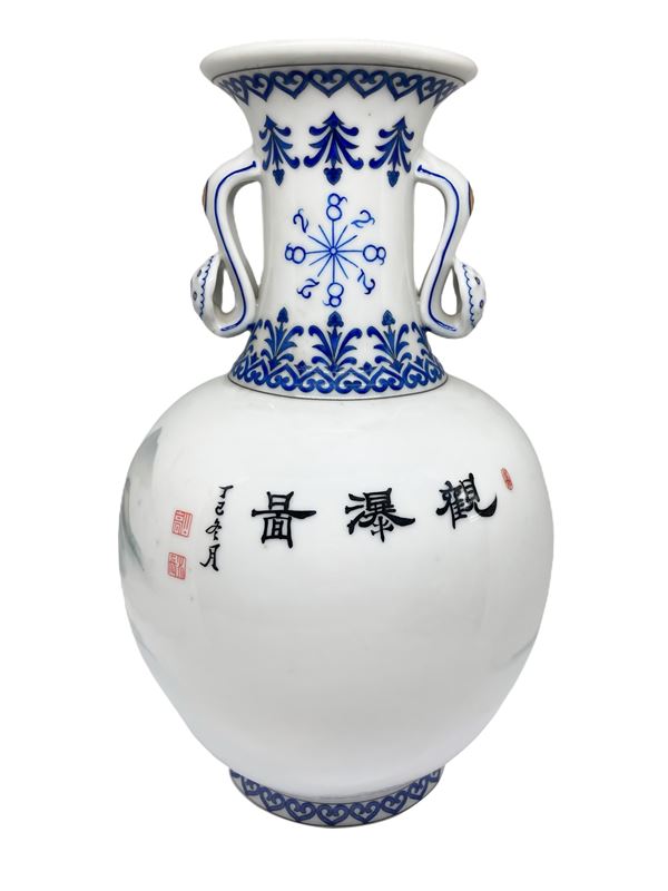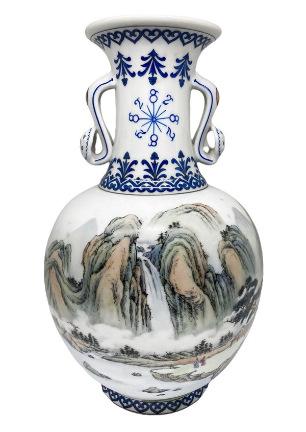 Vaso cinese biansato a fondo bianco, decorato nei toni del blu