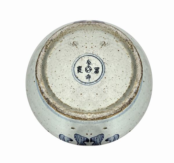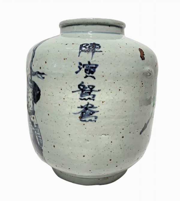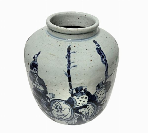 Vaso cinese in ceramica bianca con decori blu raffigurante samurai.
