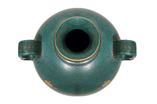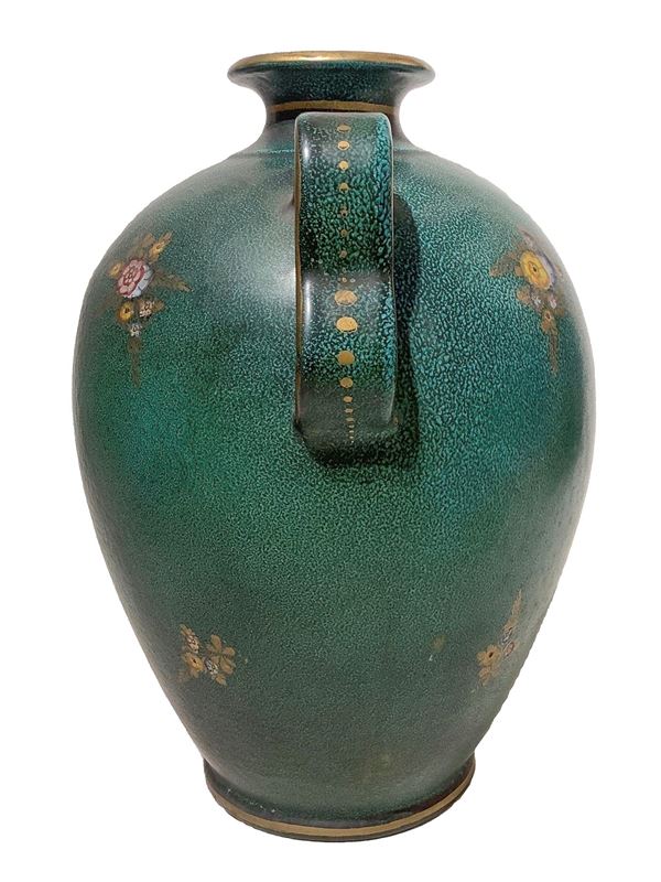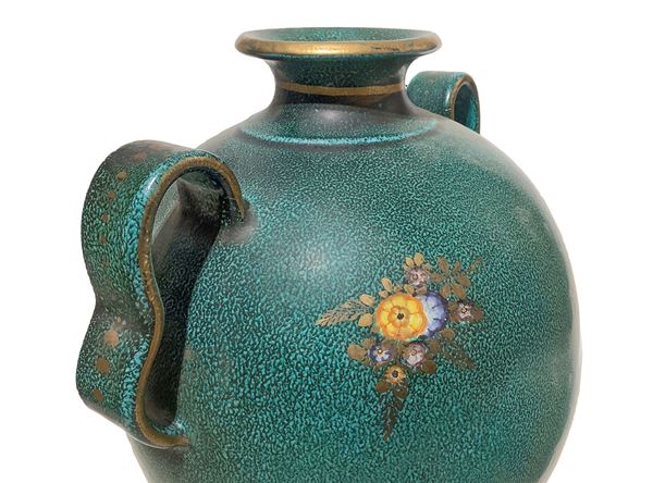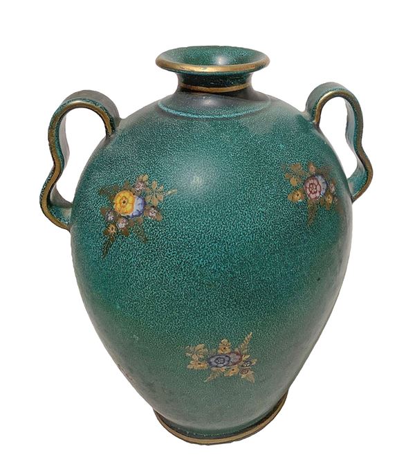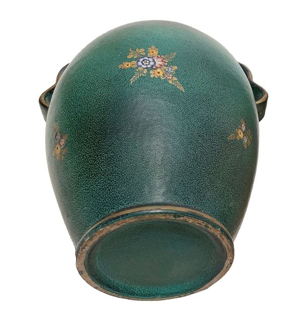 Vaso in maiolica su fondo verde, con decorazioni floreali., XX secolo