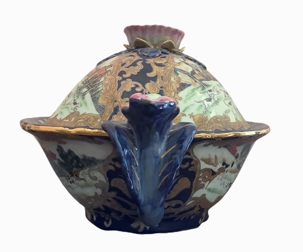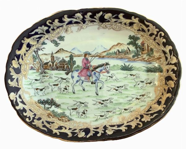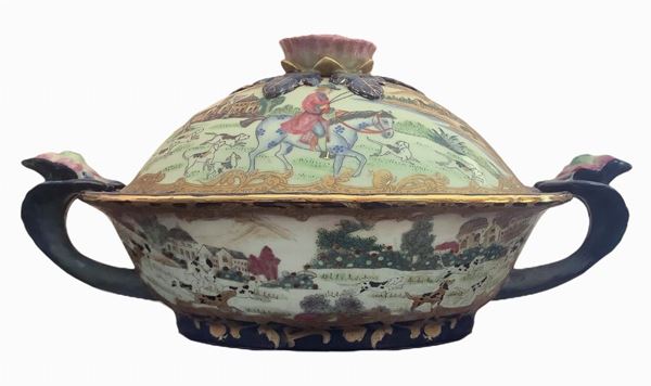 Policroma con paesaggio e cavaliere, particolari in oro e presa con decorazione floreale.